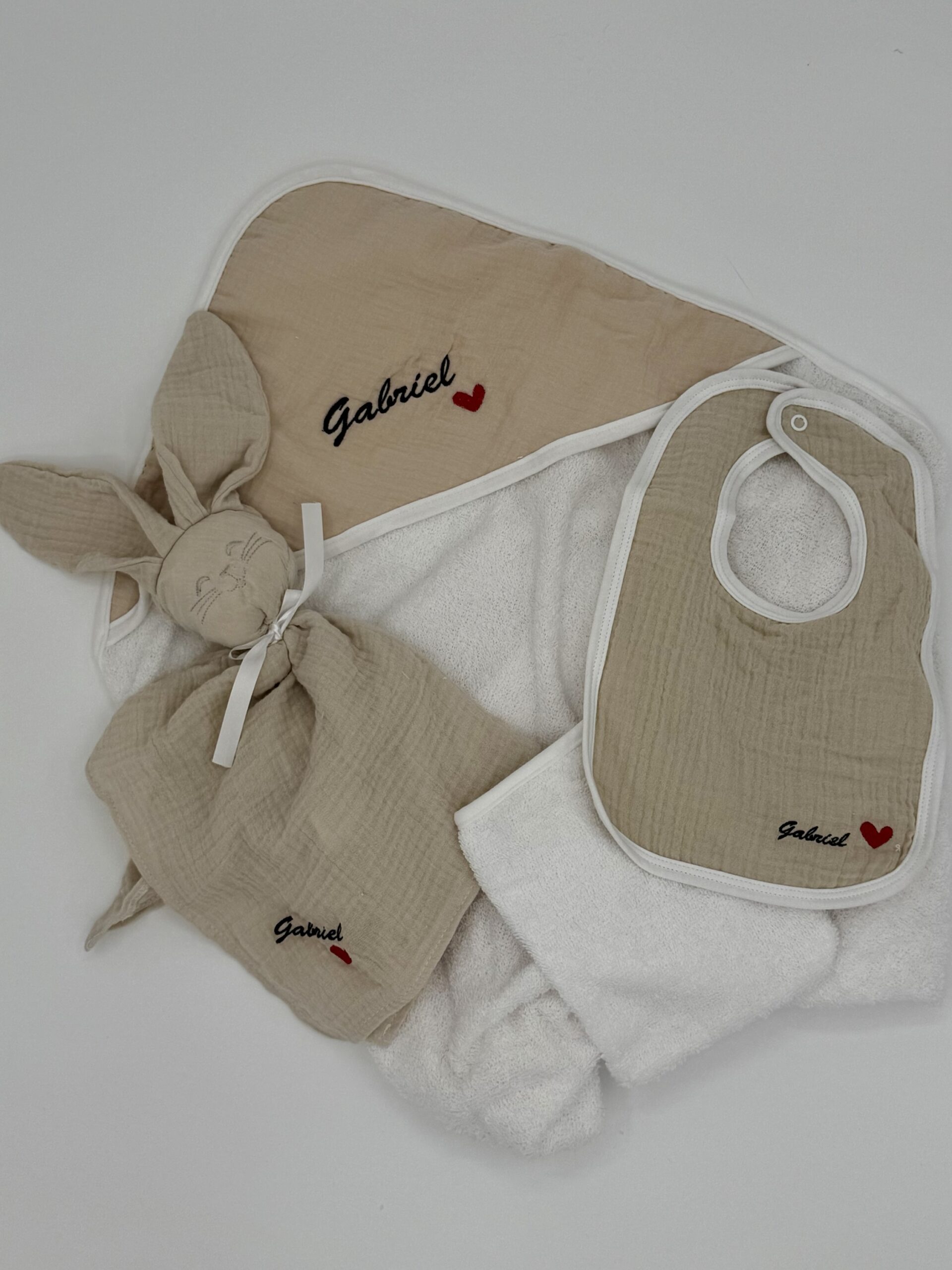 Box naissance personnalisée – Cape de bain, bavoir & doudou brodé